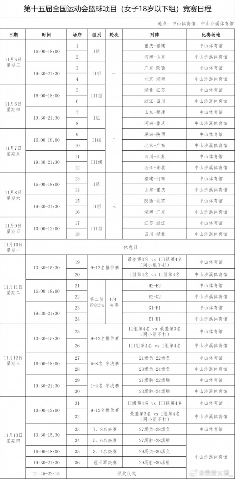 2025-10-15 17:32:02全运会女篮完整赛程出炉 大部分球队5天内打3场小组赛