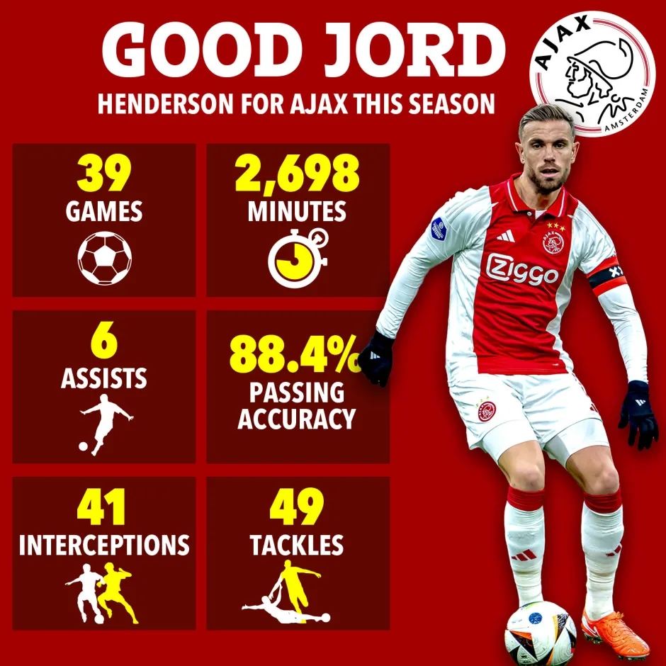 本赛季,乔丹-亨德森在阿贾克斯发挥不俗,他出战39场比赛共计2698分钟,贡献6次助攻,传球成功率88.4%,同时还有41次拦截和49次铲抢。