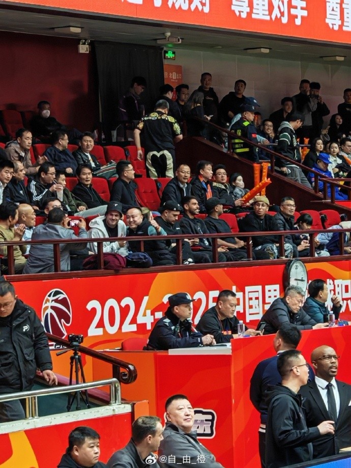 泰山队博主“自_由_橙”晒出图片,泰山外援克雷桑、马德鲁加、瓦科、卡扎尔现场观战CBA山东高速的主场比赛。