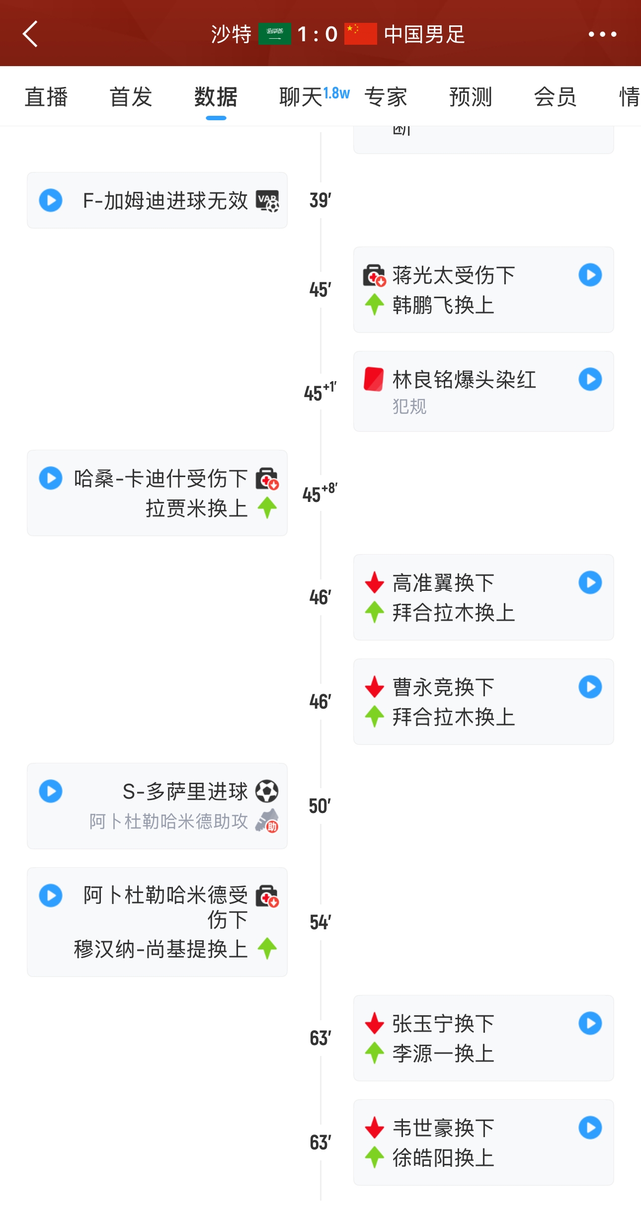 比赛第62分钟,国足已经用完了全部5个换人名额,先后登场的球员分别是韩鹏飞、拜合拉木、杨泽翔、徐皓阳、李源一,归化国脚塞尔吉尼奥无缘国足首秀!