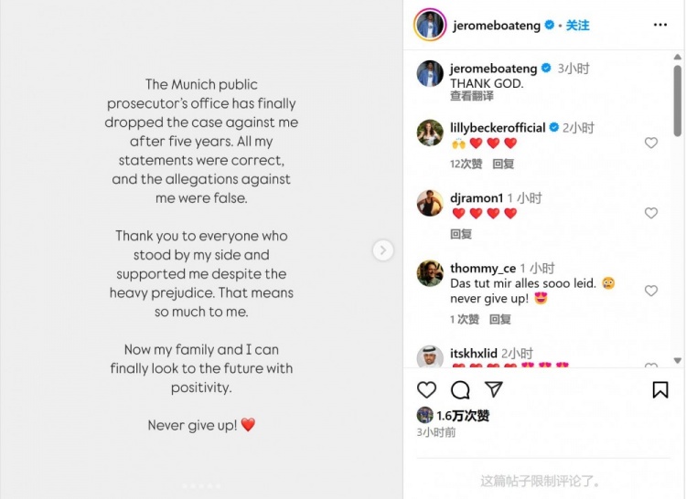 博阿滕更新社媒,庆贺针对他的家暴指控被撤销