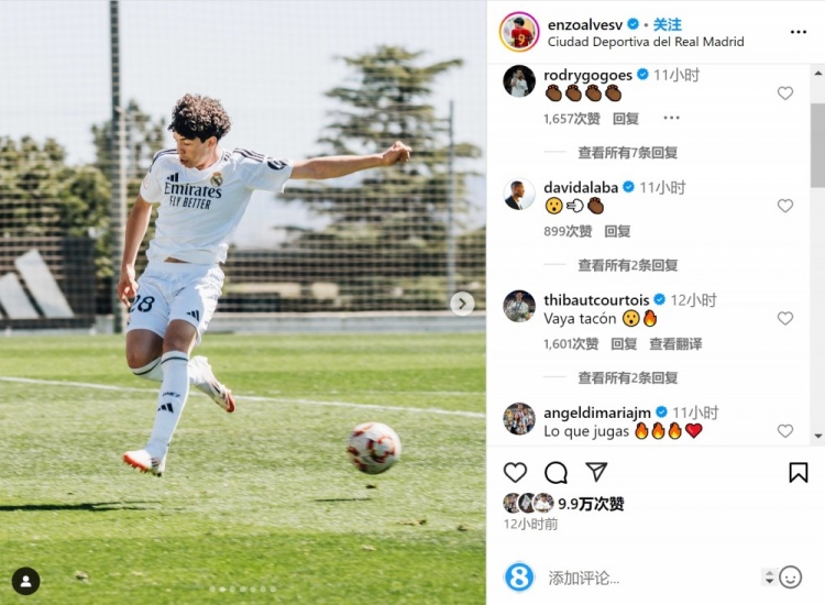 3月31日讯 马塞洛15岁儿子恩佐-阿尔维斯社媒庆祝上演皇马U19首秀,罗德里戈、阿拉巴、库尔图瓦、迪马利亚留言鼓励。